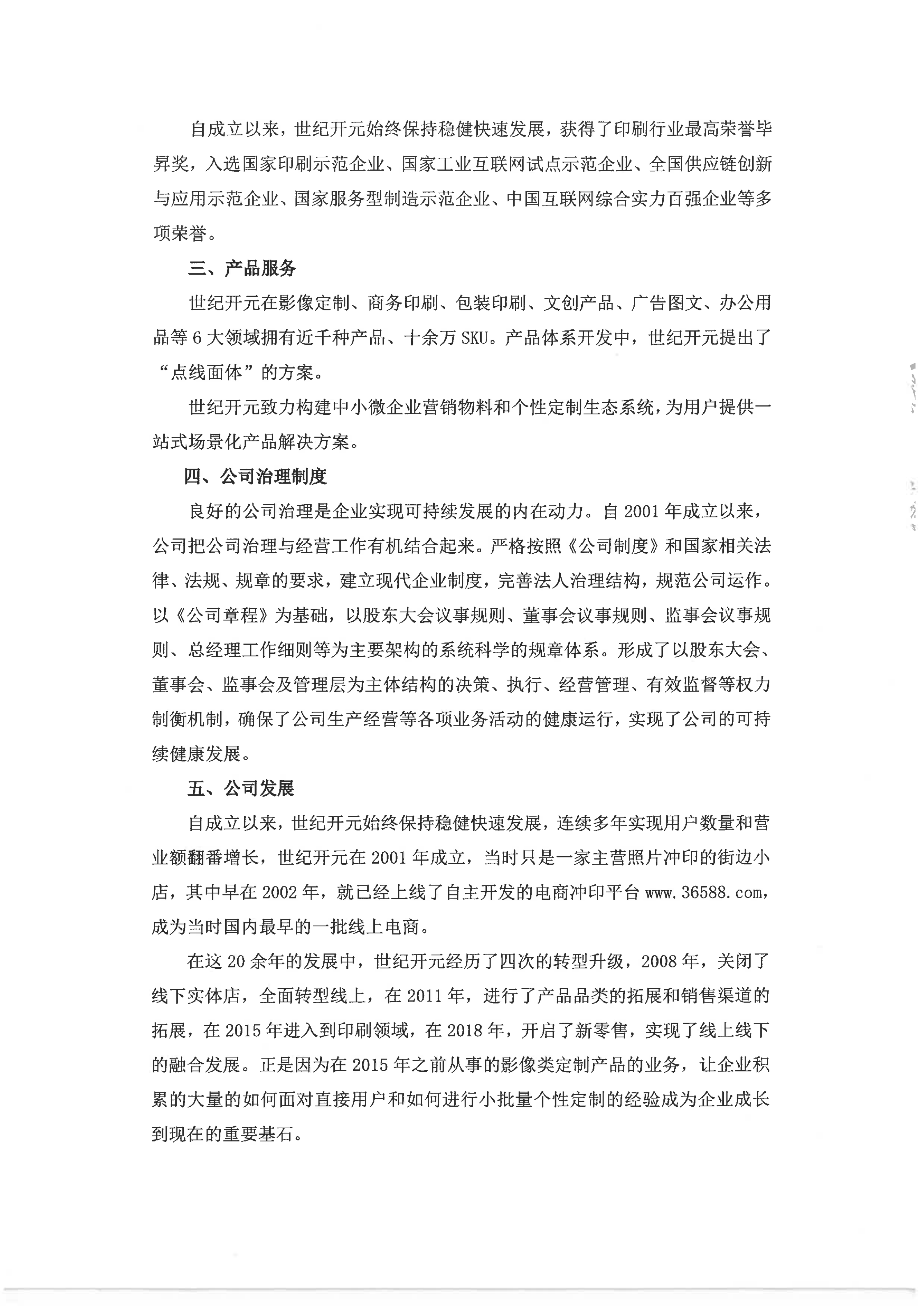 世纪开元深耕印刷业多年,紧跟新模式、新技术在传统产业中的应用及发展趋势。通过互联网、数字化、智能化等新技术和新模式提升自身的运营管理和产品服务能力,致力于打造专注于小批量、个性定制领域的印刷工业互联网。持续推进线下新零售发展战略,结合自身在印刷领域的模式优势和技术优势,拓展企业最后一公里的末端服务能力,努力实现线上和线下的融合和互补。